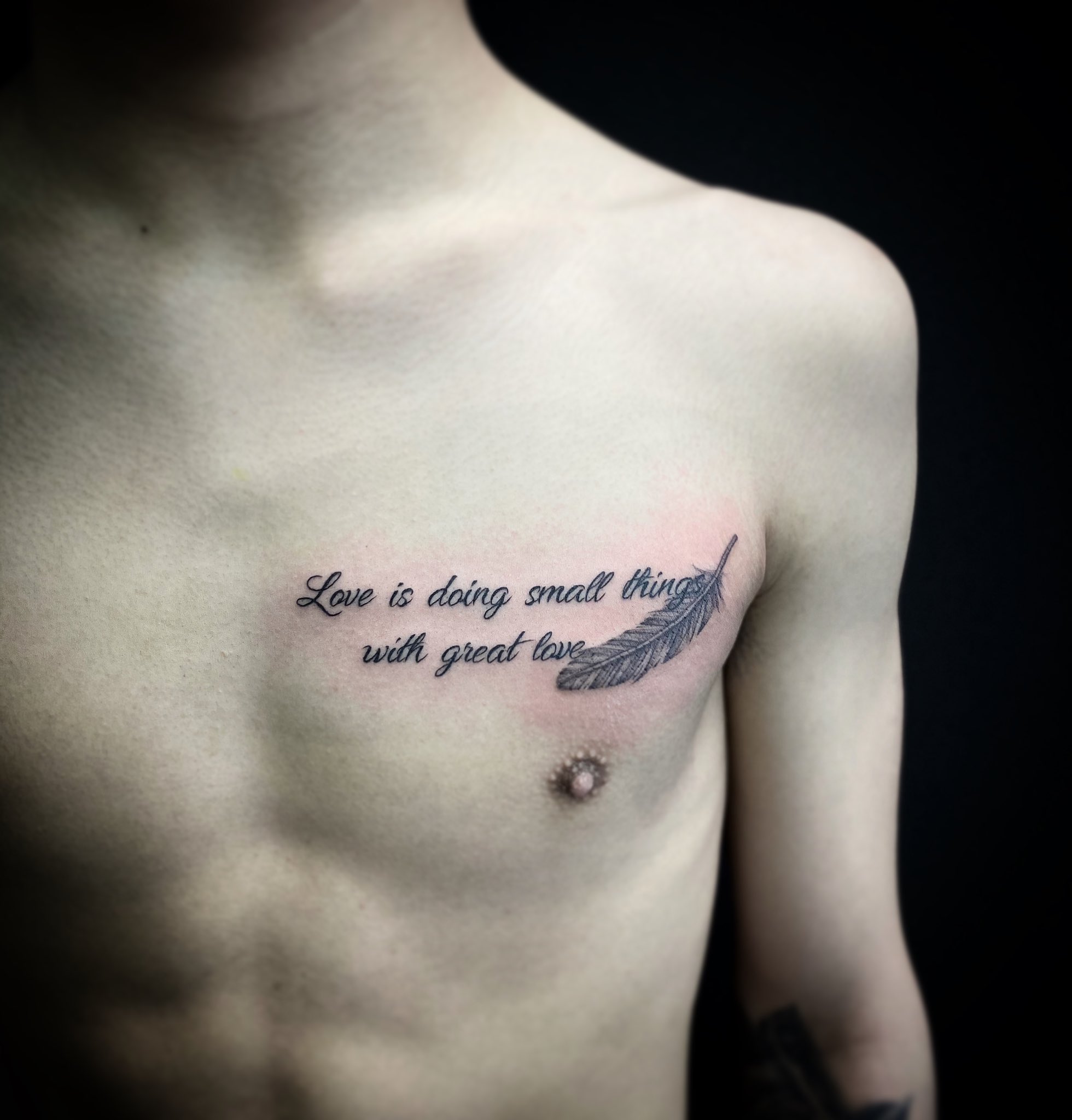 男の胸にメッセージタトゥーtattoo 千葉幕張刺青irezumi 千葉彫亜星 千葉タトゥーは千葉市花見川区幕張本郷のfree Z Tattoo フリーズタトゥー